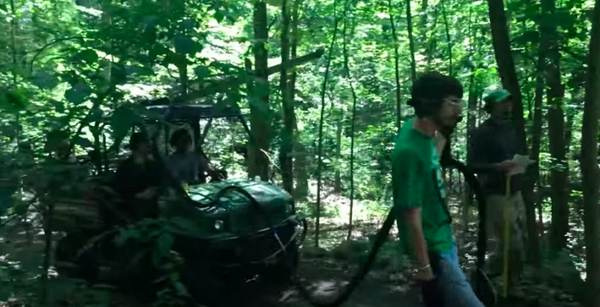 アトラスを先頭に確認できるだけで6名のメンバーが後ろを歩き、アトラスを給電するためのバッテリーを積んだトラクターに2名が乗車している。決して整った道ではないが、人の歩行スピードと遜色ないスピードで等身大のアトラスが歩いている。途中、犬の顔が一瞬映されるが、犬もロボットに注目しているのが見て取れる。