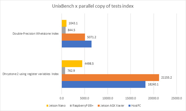 今回はJetson Nanoの他,、RaspberiPi3+、Host PC、Jetson AGX Xavier(30Wモード)の3台で整数演算(Dhrystone)、浮動小数点演算(Whetstone)のベンチマークを比較してみます。