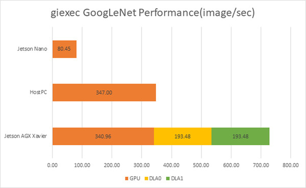 次にGPU性能の計測を行いましょう。giexecというツールで学習モデルにGoogleNetを使って秒間何イメージ計算できるか計測した結果です。