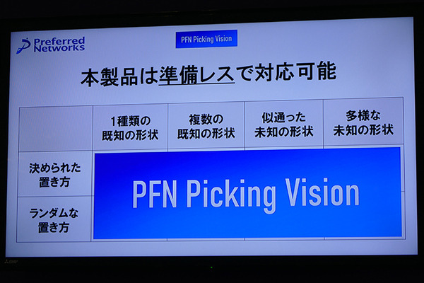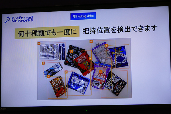 ピッキングロボット向けビジョンソフトウェア「PFN Picking Vision」は事前準備が少なくてすむ高速画像認識ライブラリ。従来システムでは普通は必要となる3次元CADモデルによる形状登録・識別箇所登録・把持点登録が不要で、学習済みのモデルを使って、バラバラに積まれた初見の物体も約0.2秒で検出できるという。
