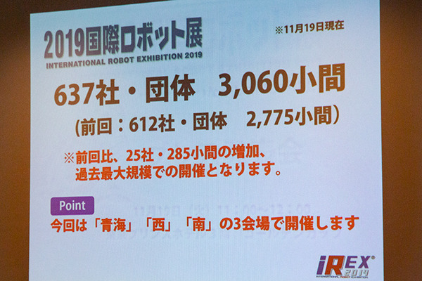 展示会では過去最大の637社が3060コマで出展し、産業用からサービス用まで最新のロボットが一堂に介するものになる。前回は2017年に開催、612社、2775コマの展示だったので規模は拡大している(13万人超が来場/海外から1万人弱)。今年で23回目。