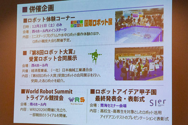 運営委員長の安川電機の小笠原氏は「ロボットはAI、IoTなどの最新技術の中心に位置づけられ、大きな盛り上がりを見せている。近い将来、ロボットと人は必ず共存、協働していくことは間違いない」とし、「今回の展示会では、WRS(World Robot Summit)のトライアル競技会やロボットアイデア甲子園も開催する」と語った。