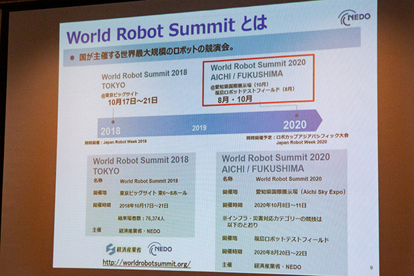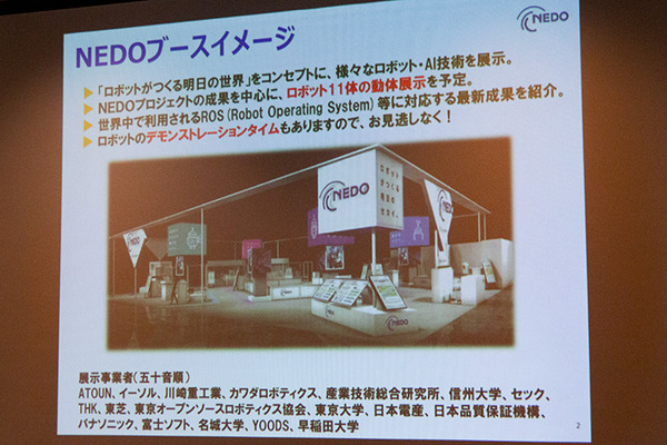 NEDOからはロボット・AI部の小林氏が登壇し、NEDOブースでの各種ロボット展示、講演会、WRSトライアル等を予定しているとのこと。