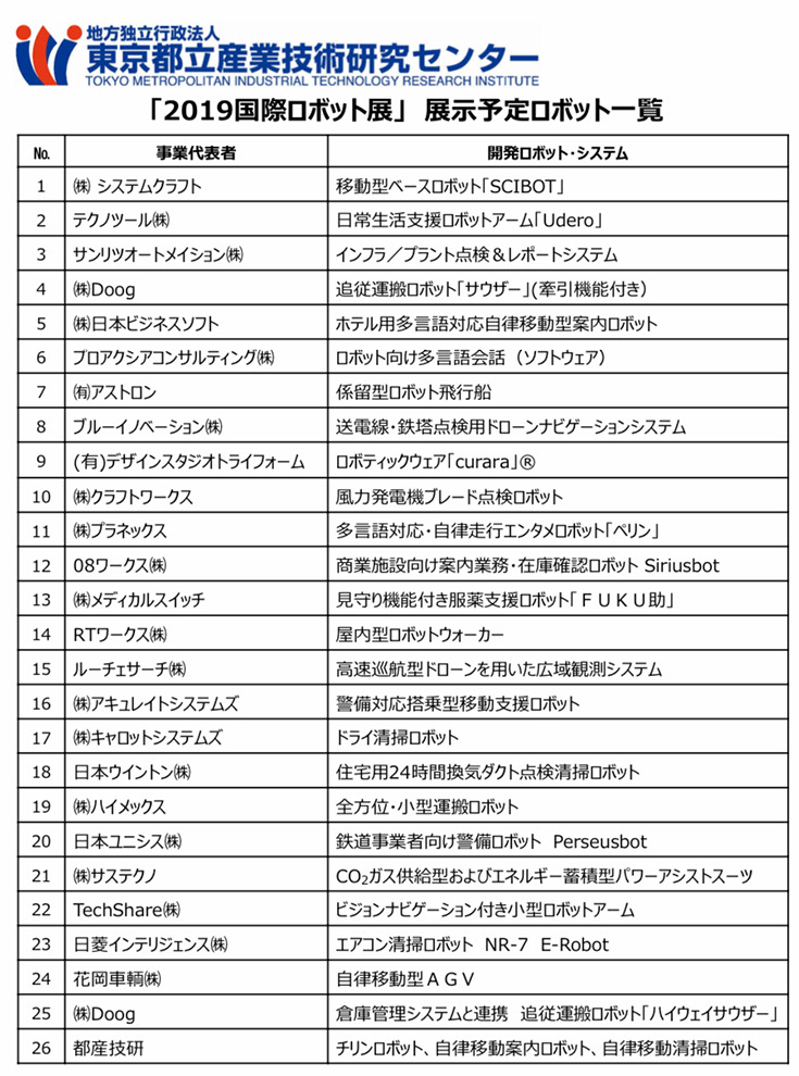 一部といっても25体、都産技研のものも加えると26体もの最新ロボットが見られる。以下がそのリスト。