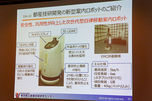 都産技研は自身で開発してきた自律移動型の案内ロボットは市場に投入できる段階に達しているとしている。現地で展示される予定なので、このロボットも見ることができる。