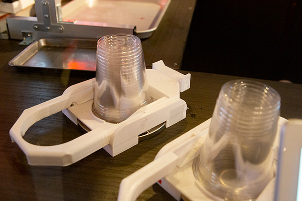 いつも驚かされるのが、接客ロボットの動作にはカメラ(ビジョン)を一切使っていないことだ。コップを掴んだり、お酒を注いだり、マドラーをつまむのに映像解析を使わず、正確な動きでこなしている。そのためには、コップをとるときに次のコップの位置がずれてもきちんと元の位置に戻るしくみや、マドラーを返却するときにも元の位置に寸分違わず戻す工夫がされている。