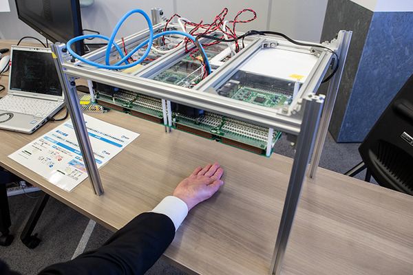 体験デモでは、差し出した手の平に超音波を集束させて焦点を作って、非接触の触覚を生みだす。